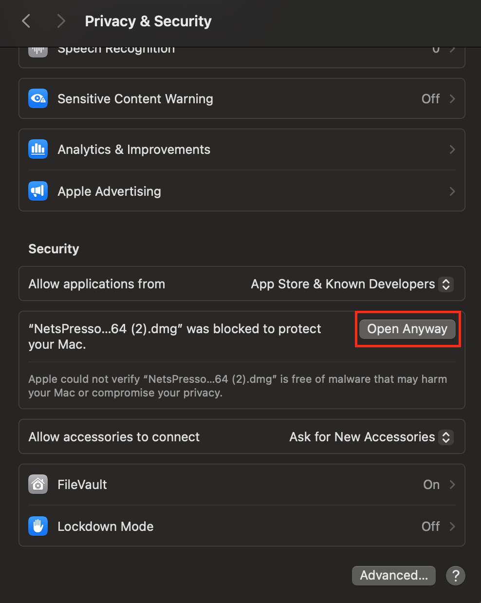 When installing NetsPresso Training Studio (GUI) on macOS, you may see a security warning because the app is not notarized by Apple. Follow the steps below to allow the app to run.