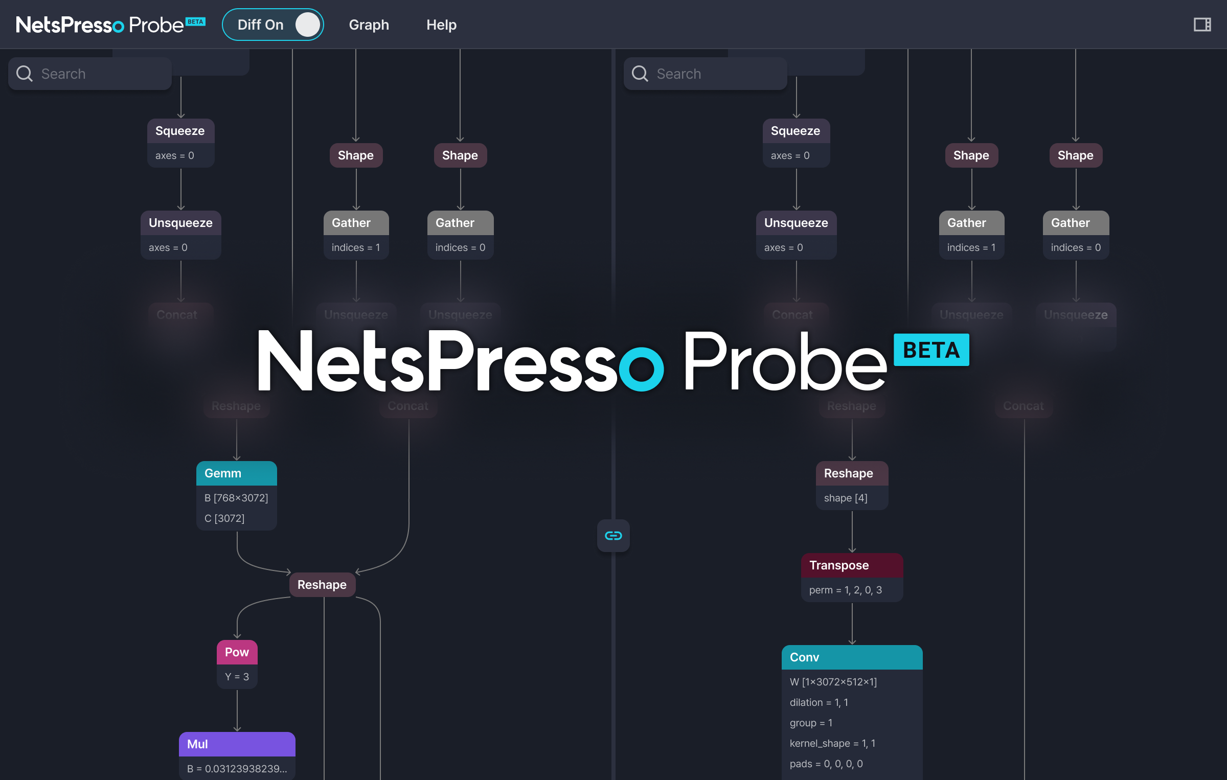 NetsPresso Probe is a browser-based graph visualizer designed for AI engineers who need to quickly inspect, compare, and understand neural network models.
